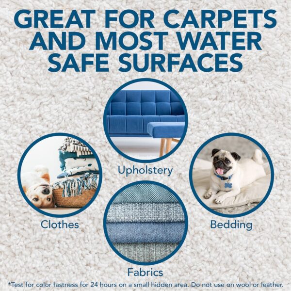 - Works on carpets and most water safe surfaces such as upholstery, bedding, fabric and clothes.