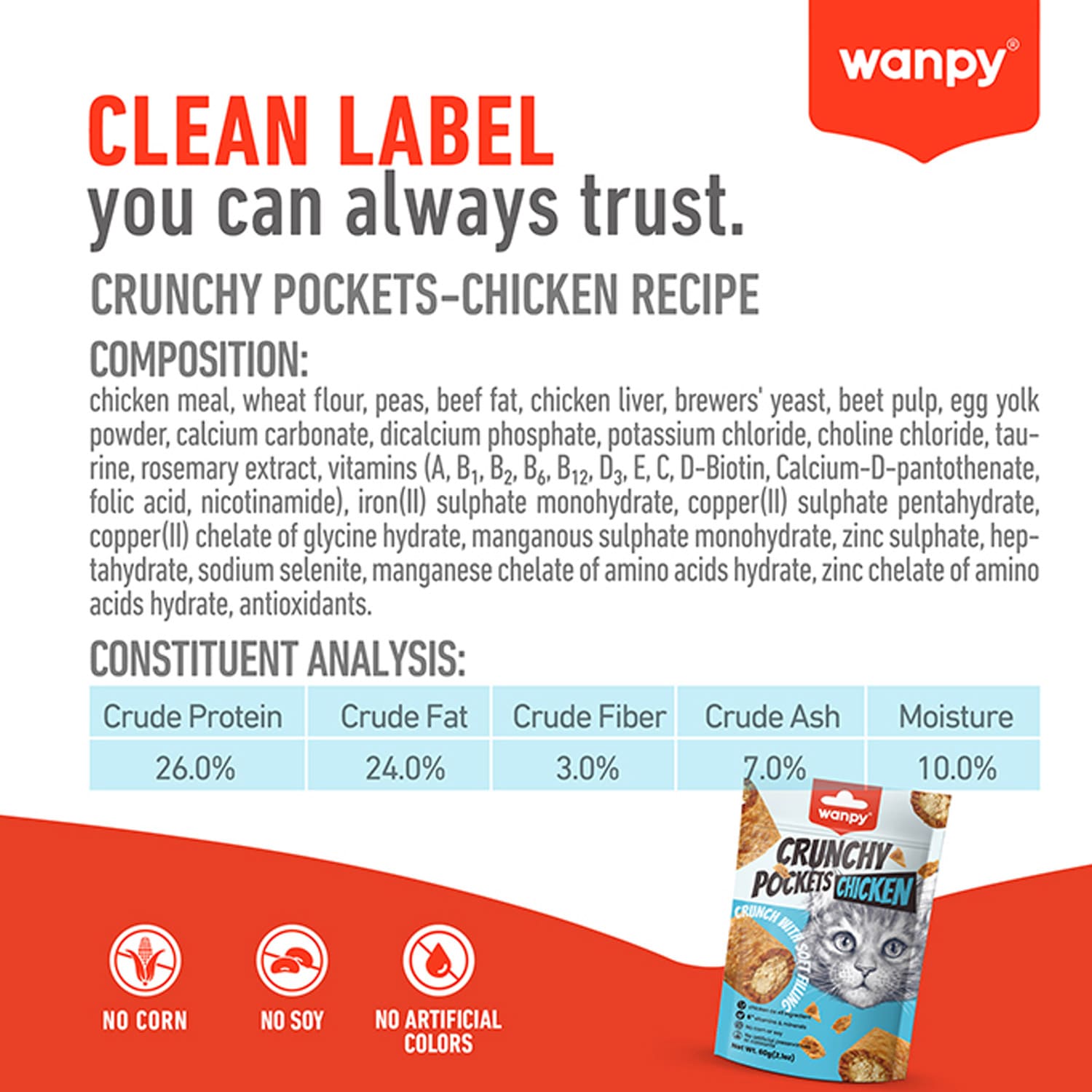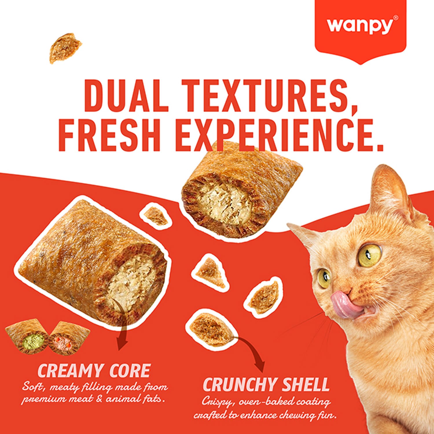 WANPY Crunchy Pockets Chicken Recipe offer a double-layered treat with a crunchy shell and a soft, savory center made from select real chicken meat for an irresistible bite every time.